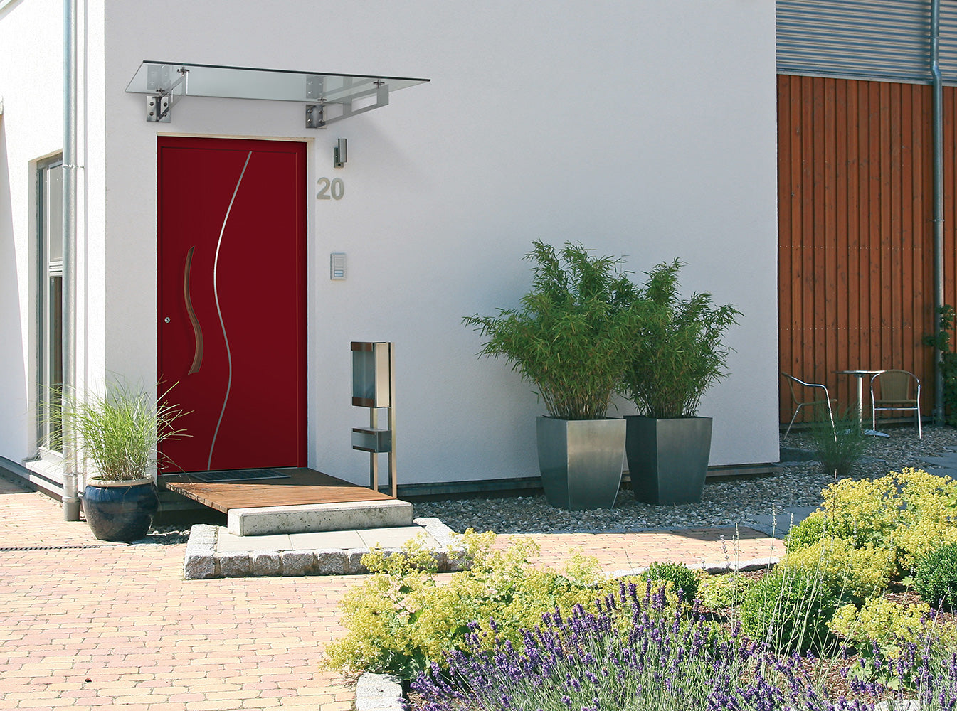 In der Standardausführung ist der Rahmen in Edelstahl matt gebürstet. Sie können Ihr formschönes Vordach aber auch für farbliche Akzente nutzen. Wir pulverbeschichten Ihnen den Rahmen in jeder beliebigen RAL-Rarbe.